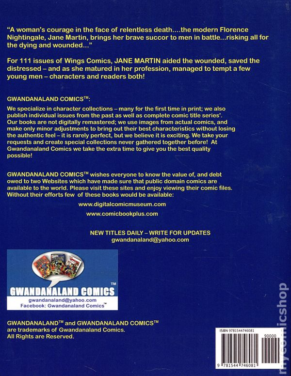 Volume 508 - 1st Printing. "Jane Martin - War Nurse! - Volume 1" Collects material originally published in Wings Comics (1940) #1-59. These budget friendly reprints of classic western sci-fi, horror, and adventure comics feature some of the best in public domain comic book reprints. Softcover, 8 1/2-in. x 11-in., 322 pages, full color.