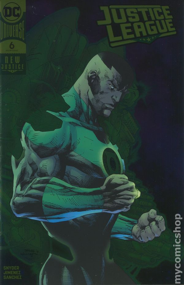 DC Boutique Edition Foil Cover. Written by Scott Snyder. Art by Jorge Jimenez and Alejandro Sanchez. Cover by Jim Lee, Scott Williams, and Alex Sinclair. Did you read the write-up on issue #5? Do you really think anything's gotten better for the Justice League in the past two weeks? Still Force? Still a thing! Ultraviolet Galaxy Lantern? Keeps attacking! Sinestro? Total garbage! Lex Luthor and Joker? Beating everyone to the Source Wall piece. If that happens? You don't wanna know. 32 pages, full color. Rated Teen+ Cover price $3.99.