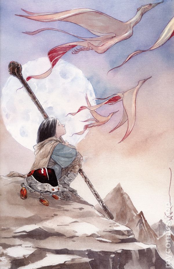 Written by Jeff Lemire. Art and Virgin Cover by Dustin Nguyen. 'THE HAUNTED GALAXY,' Part One Powerhouse creative team JEFF LEMIRE and DUSTIN NGUYEN launch an all-new sequel series to DESCENDER with the launch of ASCENDER! Set ten years after the conclusion of DESCENDER's storyline, magic has taken the place of machinery and the rules are very different indeed… Mila, the daughter of Andy and Effie from DESCENDER, spends her days exploring the lonely wilds of the planet Sampson and trying to stay out of the clutches of the evil disciples of the all-powerful vampire witch known only as Mother. But, like her parents, Mila doesn't like to play by the rules, and when a certain robot pal of her dad's shows up, nothing will ever be the same! With all the scope and heart of the sci-fi classic DESCENDER, LEMIRE and NGUYEN reunite to take readers on an unforgettable fantasy quest! 32 pages, full color. Rated M Cover price $3.99.