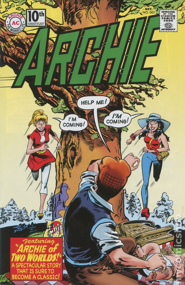 Stadium Comics Exclusive Homage (Flash #123) Cover by Nuno Pereira - Limited to 400 copies. Written by Michael Uslan. Art by Dan Parent. 10 years later, a landmark moment in Archie Comics history is being revisited! ARCHIE: THE MARRIED LIFE 10th ANNIVERSARY, is a sequel to the headline-making 2009 'Archie Wedding' storyline. The original storyline written by Michael Uslan answered Riverdale's longest-running question: will Archie marry Betty or Veronica? Fans were treated to two alternate worlds that explored each possibility and Uslan's sequel picks up both stories ten years later. See how much life has changed for Archie, his family, and the rest of Riverdale in this new and exciting mini-series. 32 pages, full color. All Ages Cover price $3.99.