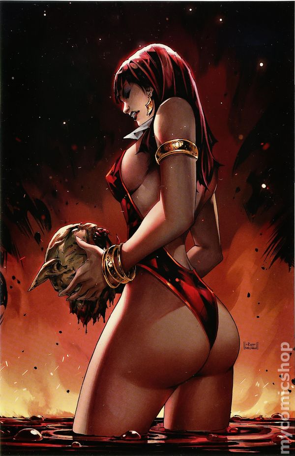 Written by Jordie Bellaire. Art by Drew Moss. Cover by Leonardo Romero and Jordie Bellaire. LET THE TEAM-UP BEGIN! In this issue: Vampirella takes a potion. Red Sonja gets hung upside-down by magic. A magical mystical mysterious gem begins to reveal its secrets. And many, many, SO many hamburgers are consumed. The ongoing sensation continues courtesy of JORDIE BELLAIRE (Buffy The Vampire Slayer) and DREW MOSS (Star Wars)! 32 pages, full color. Rated T+ Cover price $3.99.