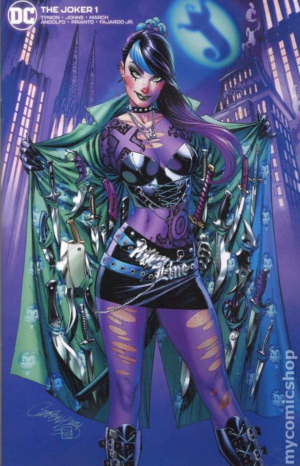 JScottCampbell.Com Exclusive "Punchline" Minimal Trade Dress Cover by J. Scott Campbell. Infinite Frontier Tie-In - Written by James Tynion IV & Sam Johns. Art by Guillem March & Mirka Andolfo. Following the events of Infinite Frontier #1, The Joker is the most wanted man in the world! But the Clown Prince of Crime is several steps ahead of law enforcement—and he's on the run overseas. James Gordon, facing retirement, realizes this is the manhunt of his life and the last piece of a storied career…but what mysterious and deadly forces are also in pursuit of The Joker? And in the backup story, following the events of the smash hit Punchline #1, DCs most controversial new villain navigates the infrastructure of Blackgate Penitentiary—while on the outside, Harper Row takes up the mantle of Bluebird to stop her brother from falling under Punchlines influence. 40 pages, full color. Rated T+