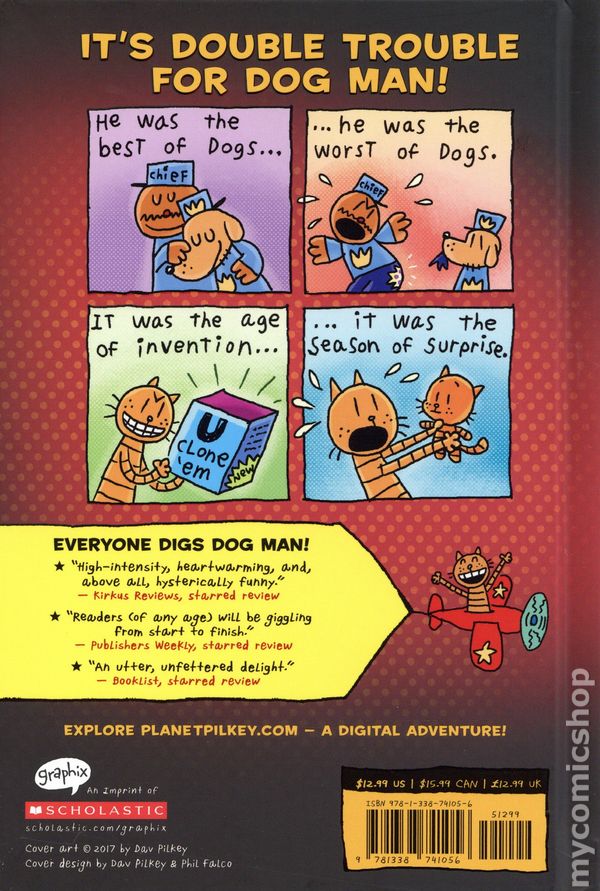 He was the best of dogs... He was the worst of dogs... It was the age of invention... It was the season of surprise... It was the eve of supa sadness... It was the dawn of hope... Dog Man hasn't always been a paws-itive addition to the police force. While he can muzzle miscreants, he tends to leave a slick of slobber in his wake! This time, Petey the Cat's dragged in a tiny bit of trouble -- a double in the form of a kitten clone. Dog Man will have to work twice as hard to bust these furballs and remain top dog!