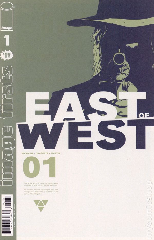 May 2022 Printing. (W) Jonathan Hickman (A/CA) Nick Dragotta OUT OF THE WASTELAND' The things that divide us are stronger than the things that unite us. A Sci-Fi Western set in a dystopian America where all hope for the future rests in the Four Horsemen of the Apocalypse...who just happen to be trying to kill the President of the United States. One of the most exciting new books of the year, this is EAST OF WEST, a brand new, ongoing, monthly comic from the award-winning team of Marvel's FF, JONATHAN HICKMAN and NICK DRAGOTTA. Cover price $1.00.
