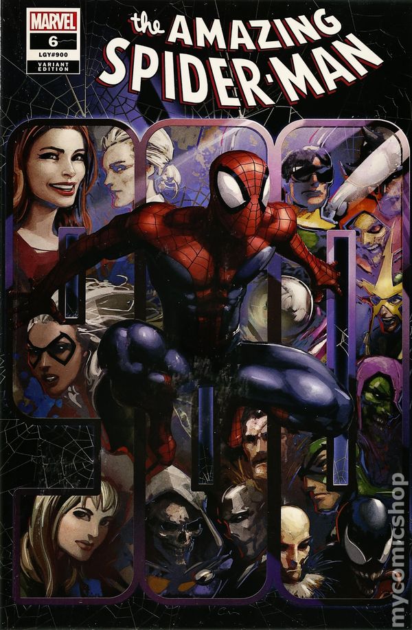Limited 1 for 25 Retailer Incentive Variant Cover. Written by Zeb Wells. Art by Ed McGuinness. Cover by Julian Totino Tedesco. LANDMARK ISSUE #900! The nine-hundredth issue of AMAZING SPIDER-MAN comes out the month of Spider-Man's 60th Anniversary, and we are pulling out ALL THE STOPS! Someone from Spider-Man's past has captured the Sinister Six and used them to create the truly terrifying SINISTER ADAPTOID! This is one of the biggest adventures in Spider-History and you will not believe the ending! 96 pages, full color. Rated T+ Cover price $9.99.