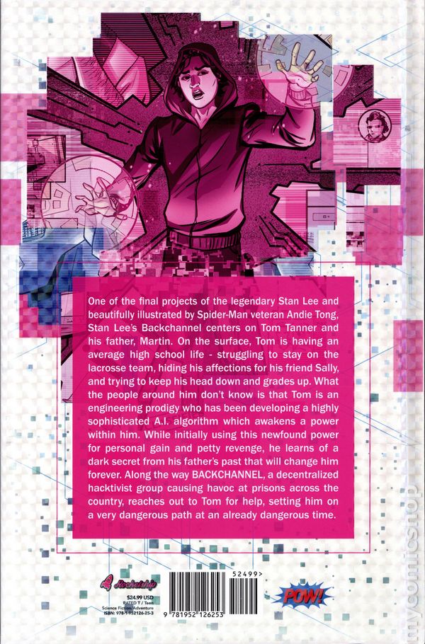 Volume 1 - 1st printing. Written by Stan Lee and Tom Akel. Art by Andie Tong, Ryan Benjamin, and Orlando Caicedo. Cover by Andie Tong. Foreword by Fabian Nicieza. One of the final projects of the legendary Stan Lee and beautifully illustrated by Spider-man veteran Andie Tong, BACKCHANNEL centers on Tom Tanner and his father, Martin. On the surface, Tom Tanner is having an average high school life - struggling to stay on the lacrosse team, hiding his affections for his friend Sally, and trying to keep his head down and grades up. What his father, an LA police detective, and friends don't know is that Tom is an engineering prodigy and is being recruited by BACKCHANNEL, a decentralized hactivist group causing havoc at prisons across the U.S. While developing a highly sophisticated AI algorithm, a power awakens within Tom that grants him the ability to mentally hack into any device (technopathy). While initially using this newfound power for personal gain and petty revenge, he learns of a dark secret from his father's past that will change him forever. In need of a moment of escapism, Tom returns to his favorite digital comics. This time though, the comic is disturbingly on point with what Tom has been experiencing. As he continues to read, Tom realizes that there are encrypted messages in the comic from an unknown ally who clearly knows everything Tom has been up to. When he discovers that the hacktivist group BACKCHANNEL has been tracking him and is aware of his new abilities and reaching out to him for help, Tom is set on a very dangerous path. Softcover, 130 pages, full color. Teen Cover price $19.99.