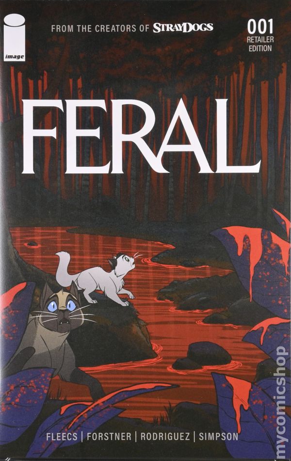 Retailer Edition Variant Cover by Trish Forstner. Written by Tony Fleecs. Art by Trish Forstner, Tone Rodriguez. SERIES PREMIERE A NEW HORROR FROM THE CREATORS OF STRAY DOGS! Meet Elsie, Lord Fluffy Britches, and Patch, three indoor cats lost in the not-so-great outdoors during a nightmarish rabies outbreak. Without their humans to protect them, the cats rush to find their way home before they're eaten by the forest full of rabid beasts on their tails. Don't get bit. Don't get scratched. Don't become…FERAL. 28 pages, full color. Rated T+
