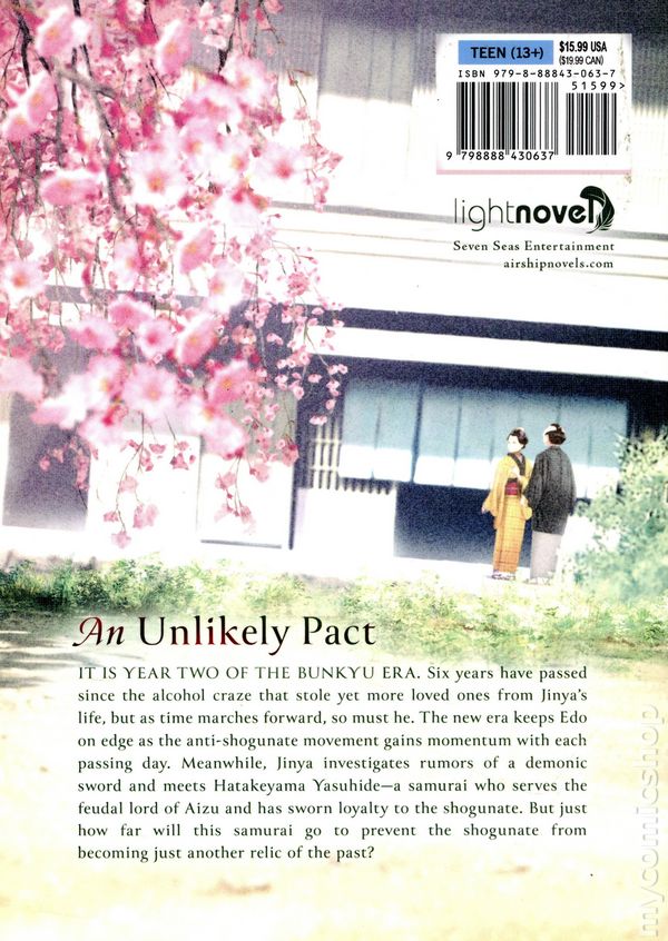 Volume 4 -1st printing. Written by Motoo Nakanishi. Translated by Kevin Ishizaka. Adapted by Athena Michaels. AN UNLIKELY PACT. It is year two of the Bunkyu era. Six years have passed since the alcohol craze that stole yet more loved ones from Jinyas life, but as time marches forward, so must he. The new era keeps Edo on edge as the anti-shogunate movement gains momentum with each passing day. Meanwhile, Jinya investigates rumors of a demonic sword and meets Hatakeyama Yasuhide—a samurai who serves the feudal lord of Aizu and has sworn loyalty to the shogunate. But just how far will this samurai go to prevent the shogunate from becoming just another relic of the past? Softcover, 5-in.x 7-in., 328 pages, Text (with B&W Chapter Illustrations). Mature Readers Cover price $15.99.