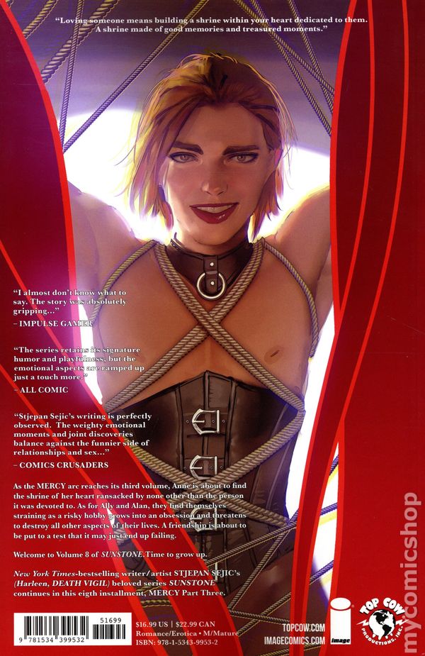 Volume 8 - 1st printing. "Mercy: Part 3!" Story and art by Stjepan Sejic. Loving someone means building a shrine within your heart dedicated to them. A shrine made of good memories and treasured moments. As the Mercy arc reaches its third installment, Anne is about to find the shrine of her heart ransacked by none other than the person it was devoted to. As for Ally and Alan, they find themselves straining as a risky hobby grows into an obsession and threatens to destroy all other aspects of their lives. A friendship is about to be put to a test that it may just end up failing. Welcome to the Sunstone Volume 8. Time to grow up. Softcover, 224 pages, full color. Mature Readers Cover price $16.99.