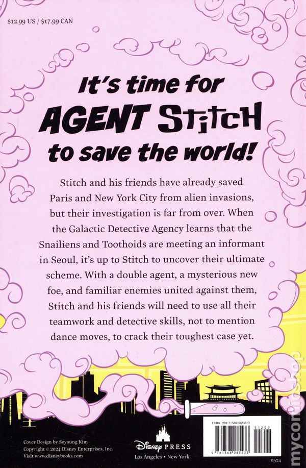 1st printing. Written by Steve Behling. Art and cover by Arianna Rea. Fans of Dav Pilkey's Dog Man and Aaron Blabey's The Bad Guys will be excited to join Agent Stitch, the world's greatest alien detective, on a musical spy mission in Seoul, South Korea—now in paperback! Intergalactic agent Stitch and his friends have protected Earth from aliens before using teamwork, gadgets, and their individual quirks—but their beloved planet is in danger once again! In the latest entry in this highly illustrated, globe-trotting middle-grade series, Stitch, Lilo, Jumba, Pleakley, and Cobra Bubbles head to Seoul, South Korea, to confront another devious cohort of aliens. Along the way, they may just find allies in one of Seouls top K-Pop girl groups… Can Stitch combine the spy skills hes learned with his love of music to stop the aliens before its too late? Hardcover, 5 3/4-in. x 8 3/4-in., 224 pages, full color. All Ages Cover price $12.99.