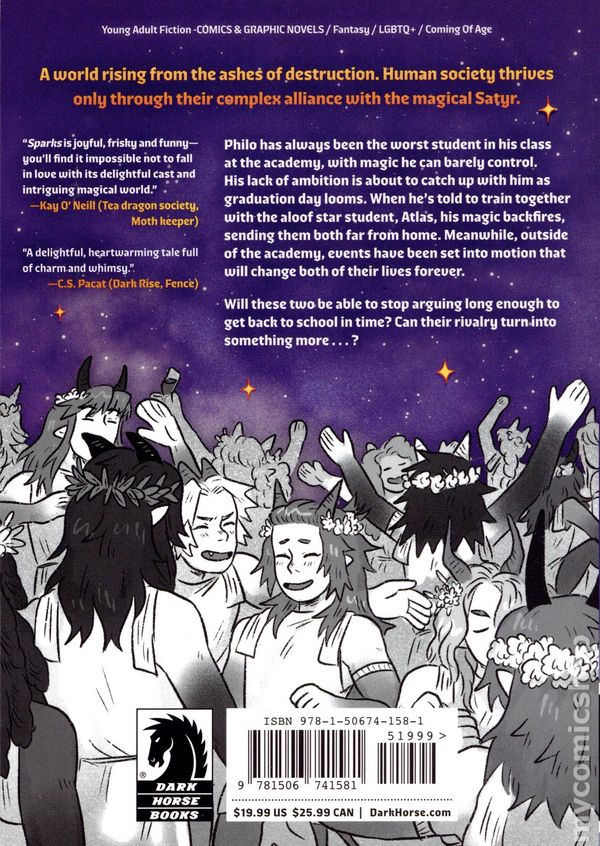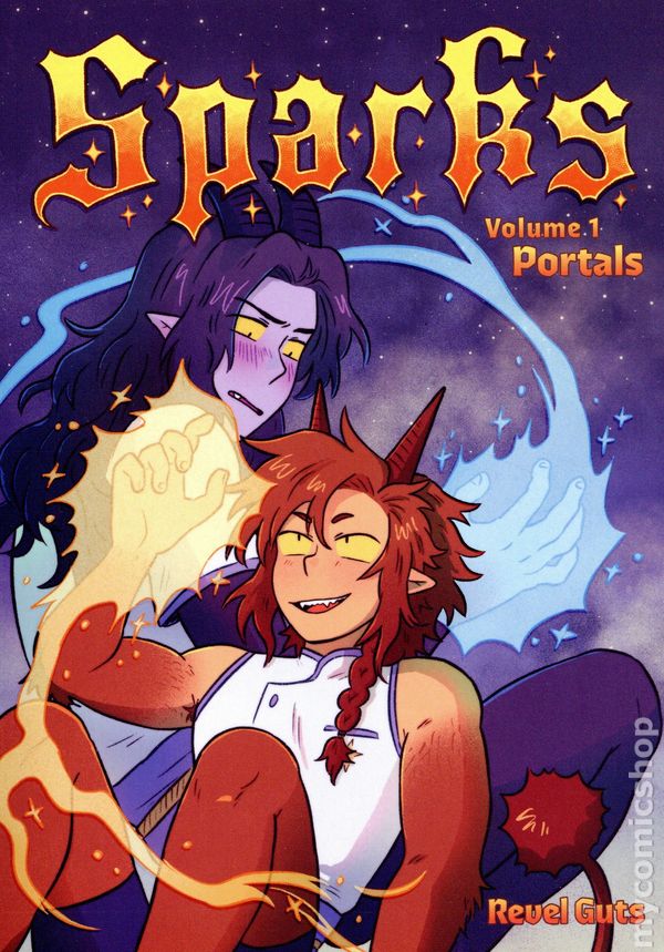 Volume 1 - 1st printing. "Portals!" Story and art by Revel Guts. Revel Guts' hit webcomic will now be in print for the first time! Sparks is a coming-of-age queer romance that can't be missed by fans of LGBTQ+ fantasy and adventure. In a world rising from the ashes of destruction, Human society thrives only through their complex alliance with the magical Satyr. Philo has always been the worst student in his class at the academy, with powerful magic he can barely control. His lack of ambition and discipline is about to catch up with him as graduation day looms. When he's paired to train together with the aloof star student Atlas, Philo's magic backfires, teleporting them both far from home. Now, their futures depend on them working together to make it back to their school in time. In just a few short days the pair find common ground that their years of classes together never managed to build, and at some points Philo questions if he didn't have the wrong idea of Atlas the whole time-wondering if their struggles to get home might plant the seeds for something bigger. Meanwhile, powers outside the academy are setting plans in motion that may change both of their lives. Softcover, 5-in. x 7-in., 176 pages, full color. Cover price $19.99.