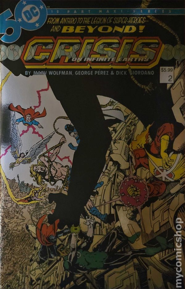 Foil Cover. Written by Marv Wolfman. Art by George Perez, Dick Giordano. Cover by George Perez. Already 1,000 universes have died, and the Monitor has summoned a group of 15 heroes and villains in a race against and through time to save this one. Part two of the epic storyline is faithfully reproduced and represented in this facsimile edition. 32 pages, full color. Rated T+ Cover price $5.99.