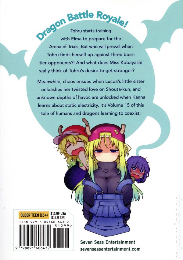 Volume 15 - 1st printing. Story and art by Coolkyoushinja. Translated by Jerry McKeon. DRAGON BATTLE ROYALE!! Tohru starts training with Elma to prepare for the Arena of Trials! But who will prevail when Tohru finds herself up against three boss-tier opponents?! And what does Miss Kobayashi really think of Tohru's desire to get stronger? Meanwhile, chaos ensues when Lucoa's little sister unleashes her twisted love on Shouta-Kun, and unknown depths of havoc are unlocked when Kanna learns about static electricity! Softcover, 5-in. x 7-in., 176 pages, B&W. Parental Advisory Cover price $12.99.