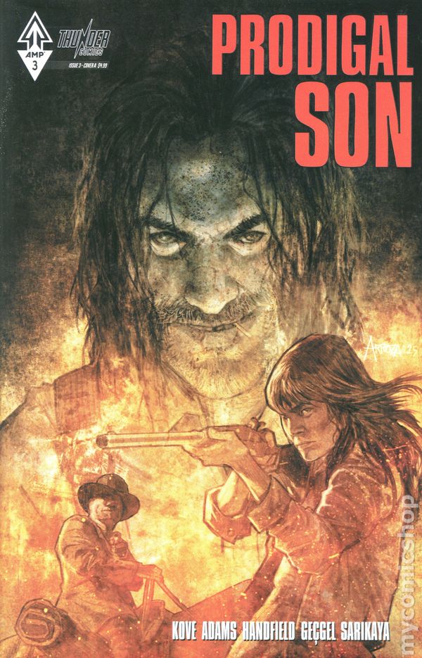 (W) Martin Kove, Clay Adams, and Don Handfield (A) Alper Geçgel (CA) Erwin J Arroza Amp Comics & Thunder Comics Presents: Prodical Son. The hunters become the hunted when The Grey Devils turn the tables on the unlikely band of outlaws chasing them. After a fierce firefight, who will remain to carry out the Man in Blacks vendetta? Back for a second printing! 32 pages, full color, not rated. Cover price $4.99.
