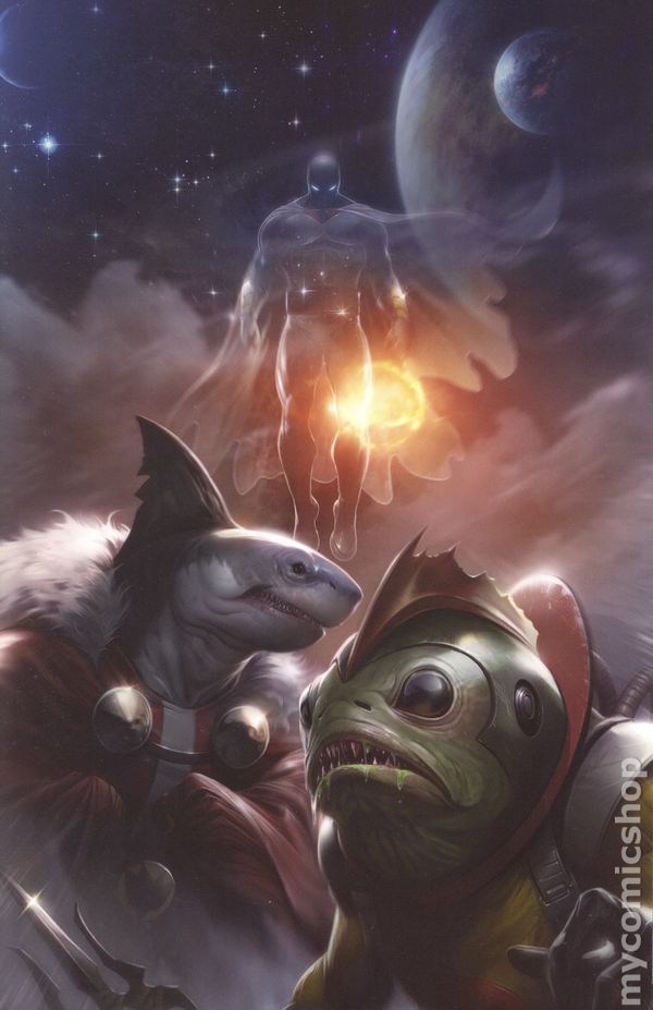 (W) David Pepose (A) Jonathan Lau (CA) Francesco Mattina CAUGHT BETWEEN A ROCK AND A SHARK PLACE! In an effort to stop the perpetual feuding between the Crystalline Empire and the Kingdom of the Space Sharks, Space Ghost and the twins are guarding a summit between the two powers — only to have it derailed by a mysterious assassination attempt. With interplanetary war now looming, can the team track down the culprits in time to pull everyone back from the brink of annihilation? Find out in the most world-shaking issue of DAVID PEPOSE and JONATHAN LAUs Space Ghost yet — featuring appealingly apocalyptic covers from FRANCESCO MATTINA, JAE LEE & JUNE CHUNG, MICHAEL CHO, and BJORN BARENDS! 32 pages, full color, rated teen. Cover price $4.99.