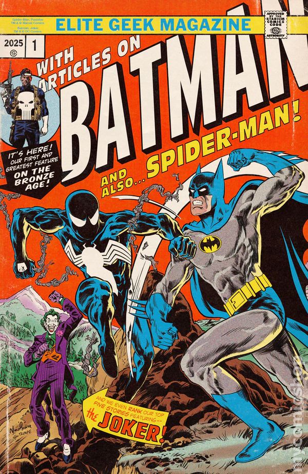 Stadium Comics Exclusive Variant Cover by Nuno Pereira. Cover homage to Incredible Hulk #181. This issue of Elite Geek Magazine features articles on Batman, Spider-man, The Bronze Age, and a ranking of the writers' top five Joker stories.