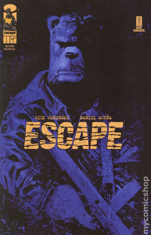 2nd Printing. Written by Rick Remender. Art by Daniel Acuna. Cover by Daniel Acuna. SERIES PREMIERE SHOT DOWN. HUNTED. OUT OF TIME. THE NEW ONGOING TWO-FISTED WAR EPIC FROM REMENDER & ACUÑA STARTS HERE. From the creative team of**_ New York Times_** bestselling author RICK REMENDER (DEADLY CLASS, Uncanny X-Force) and powerhouse DANIEL ACUÑA (Captain America, Black Panther)—the duo behind Marvels **Uncanny Avengers**—comes a savage, full-throttle wartime thriller where survival isnt given…its taken. Milton Shaw is a battle-hardened bomber pilot, flying missions over a war-torn world ruled by a ruthless empire. But when his plane is shot out of the sky, Milton wakes up behind enemy lines—in the smoldering ruins of a city he helped burn. And in less than 24 hours, his own side is dropping the big one to finish the job. Now, injured, unarmed, and being hunted through enemy streets, Miltons only shot at escape comes from the unlikeliest place: a grieving father and his son—civilians shattered by the same fascist regime that rules this land with an iron claw. Enemies by blood. Allies by circumstance. Together, theyll have to fight their way out before the bomb drops and erases everything…and everyone. Set in a brutal, fully painted world of anthropomorphic animals—think Inglourious Basterds meets Blacksad—ESCAPE is a gritty, bullet-riddled journey through wars scorched aftermath. Its about the violence we inflict, the souls we try to save, and the courage it takes to crawl out of fire. 36 pages, full color. Rated T+ Cover price $4.99.