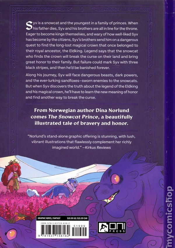 1st Printing. Story, art, and cover by Dina Norlund. Syv is a snowcat and the youngest in a family of princes. When his father dies, Syv and his brothers are all in line for the throne. Eager to become kings themselves and wary of how well-liked Syv has become by the citizens, Syv's brothers send him on a dangerous quest to find the long-lost magical crown that once belonged to their royal ancestor, the Eldking. Legend says that the snowcat who finds the crown will break the curse on their land and bring great honor to the family. But failure could mark Syv with three black stripes, and he'd be banished forever. Along his journey, Syv will face dangerous beasts, dark powers, and the ever-lurking sandfoxes-sworn enemies to the snowcats. But when Syv discovers the truth about the legend of the Eldking and his magical crown, he'll have to learn the new meaning of honor and find another way to break the curse! Hardcover, 6 1/2-in. x 9-in., 176 pages, full color. Cover price $19.99.