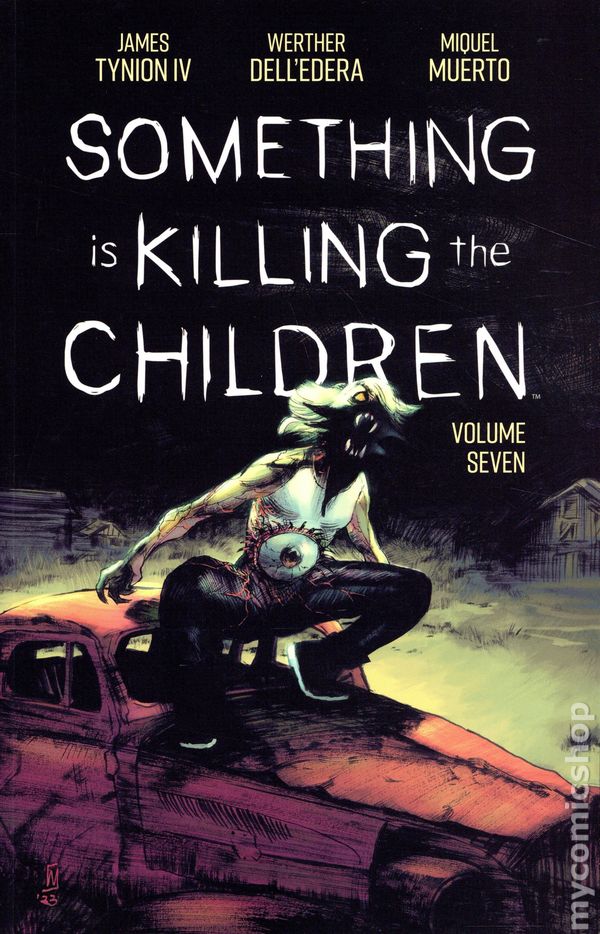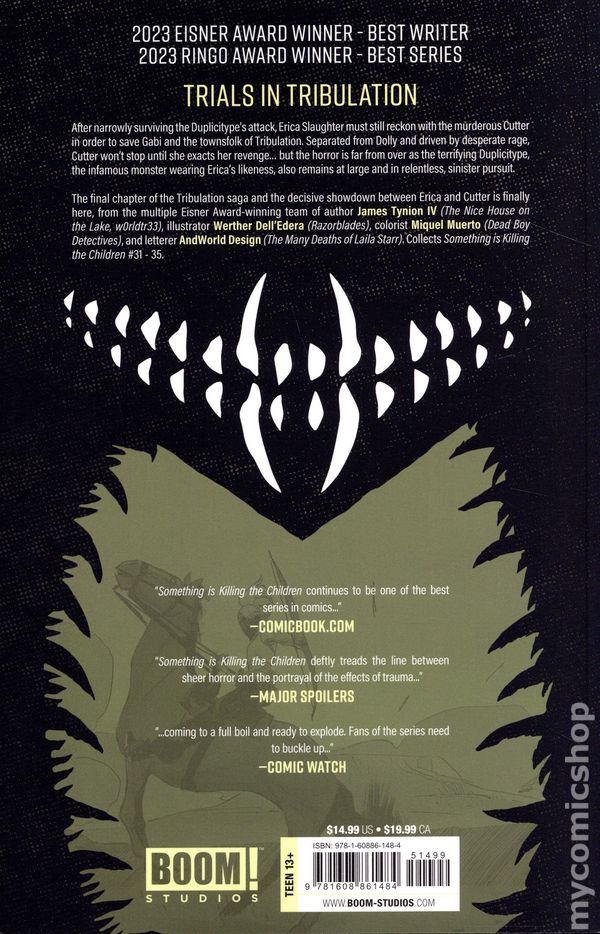 Volume 7 - 2nd and later printings. Collects Something is Killing the Children (2019 Boom) #31-35. Written by James TynionIV. Art and cover by Werther Dell'Edera. After narrowly surviving the Duplicitype, Erica Slaughter must still reckon with the murderous Cutter to save Tribulation. Separated from Dolly and driven by rage, Cutter won't stop until she gets revenge on Erica. But the horror is far from over as the Duplicitype, the infamous monster wearing Erica's likeness that changed Something is Killing the Children forever, also remains at large and in relentless pursuit! And with Cecilia showing up, will Erica finally find the ally she needs, or is betrayal in the cards? Most importantly, what chance does Erica stand? Softcover, 144 pages, full color. Cover price $14.99.