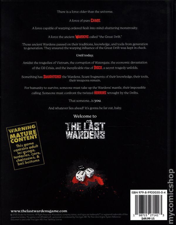 1st printing. Mutated from the Comic Book Series Created by Amit Tishler and Elliot Sperl. Written by Jason Azevedo, Jon Barry, Belinda Cornish, and Bart Vickers. Art by AJ Cassetta, Frank Cvetkovic, Marco Ferrari, Zach Howard, Victor Ibanez, Virginia Salucci, Francesco Segala, and Rui Silveira. Cover by Rob Willis. The Last Wardens Tabletop Roleplaying Game is a roleplaying game based on the universe of the comic book series created by Amit Tishler and Elliot Sperl. Set in an alternate 1975 where supernatural phenomena are increasing in frequency, players must join forces to unravel cosmic mysteries and confront mutated horrors. Hardcover, 8 1/2-in.x 11-in., 200 pages, full color. Cover price $49.99.