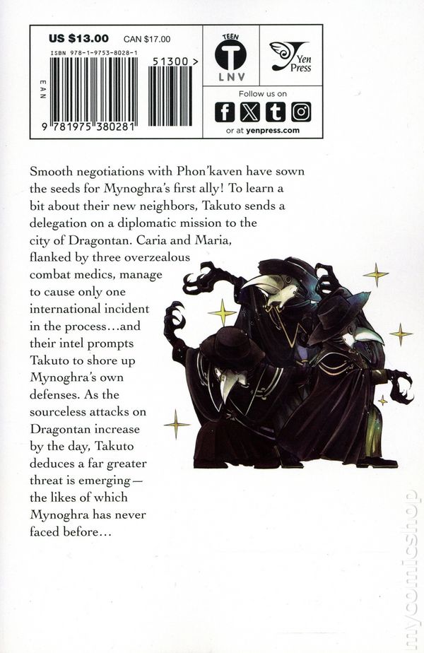 Volume 3 - 1st printing. Original Story by Fehu Kazuno. Art and cover by Yasaiko Midorihana. Character Design by Jun. Translated by Ko Ransom. Takuto has successfully brokered an alliance between Mynoghra and the neighboring nation of Phon'Kaven-- who've settled the city of Dragontan atop a vital strategic resource known as a "Dragonvein Grotto". His next move is to send a research party. After much deliberation, Takuto elects to send the twins Cary and Maria, along with a suspicious looking medic. How will they fare on the evil nation of Mynoghra's first mission...? Softcover, 5-in. x 7-in., 196 pages, B&W. Teen Cover price $13.00.