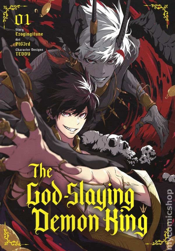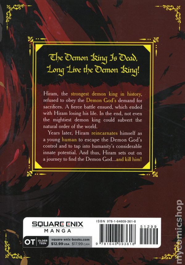 Volume 1 - 1st printing. Written by Ezogingtune. Art and cover by PIG3rd. Character Design by TEDDY. Translated by Kevin Yuan. After centuries of war between demons, the world was finally united under the overwhelming power of Hiram, the strongest demon king in history. No demon could match him, but even the mightiest king can not so easily defeat a god. When Hiram defied the demon god, he and the deity engaged in days of fierce battle where, in the end, he was cut down by divine punishment. The demon king, however, is never without contingencies! Hiram cast a spell that, in the event of his death, would reincarnate him years later with all his powers intact. Only this time, he would be born as a human, a race the demon god has no power over! With his life restored, Hiram begins a grand adventure to find the demon god and kill him once and for all! Softcover, 5-in. x 7-in., 176 pages, B&W. Older Teen Cover price $12.99.