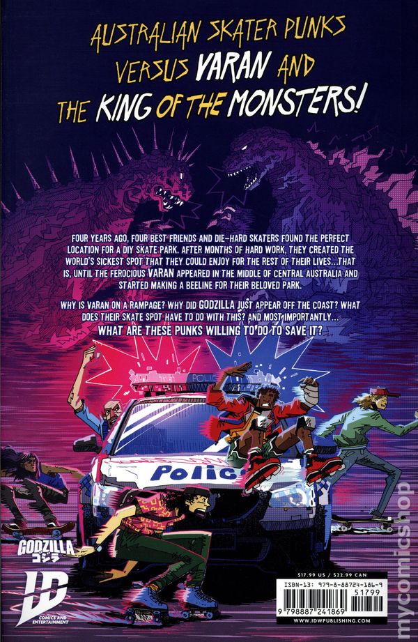 1st printing. Collects Godzilla: Skate or Die (2024 IDW) #1-5. Story and art by Louie Joyce. Four years ago, four best friends and die-hard skaters found the perfect location for a DIY skatepark. After months of hard work, they created the world's sickest spot that they could enjoy for the rest of their lives... That is, until the ferocious Varan appeared in the middle of central Australia and started making a beeline for their beloved park. Why is Varan on a rampage? Why did Godzilla just appear off the coast? What does their beloved skate spot have to do with this? And most importantly... what are these punks willing to do to save it? Softcover, 128 pages, full color. Cover price $17.99.