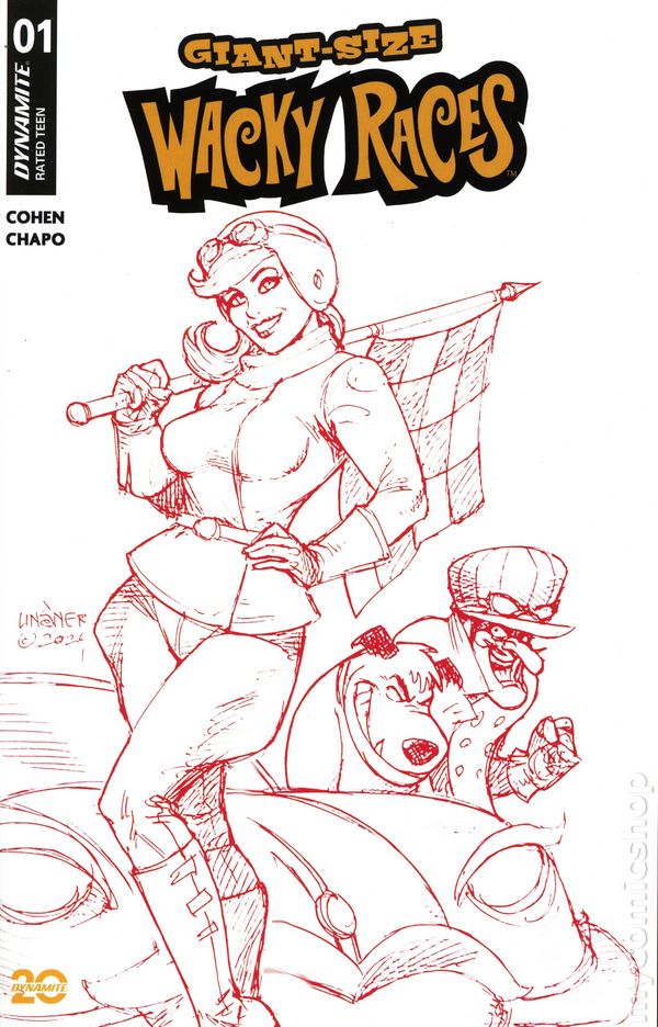 Limited 1 for 20 Retailer Incentive Variant Cover. Written by Ivan Cohen. Art by Mariano Benitiz Chapo. Cover by Joseph Michael Linsner. Featuring 40 pages of story and art! Thrill to the all-new adventures of Penelope Pitstop! This Giant-Size one-shot features three thrilling chapters that take us on a high-octane adventure from writer Ivan Cohen and super-star-artist-in-the-making Mariano Benitez-Chapo! Featuring a race-for-the-ages with tough and beautiful Penelope, handsome and mysterious Peter Perfect and of course Dick Dastardly (and a new look at Muttley! All of this action and high-speed adventure under three covers: Joseph Michael Linsner, Egal Galmon and Robert Hack! Ivan Cohen has written titles starring some of the best-loved and most-well known characters in fiction, ranging from Batman, Spider-Man, and the Teen Titans to Looney Tunes, Scooby-Doo, and even the Space Jam version of LeBron James. His work includes mainstream comics for all ages; custom projects for clients such as LEGO, Honda, Mars, Incorporated, and Snickers; the award-winning THE BATMAN & SCOOBY-DOO MYSTERIES, and the teen/adult-focused MULTIVERSITY: TEEN JUSTICE, featuring the breakthrough character Kid Quick. Wacky Races is an animated TV series, aired in 1968 to 1970 on CBS. The series was possibly inspired by the 1965 slapstick comedy The Great Race, as it consists of eleven drivers racing across North America in order to win the title of ''World's Wackiest Racer''. The cartoon has a large number of regular characters, with 23 people and animals spread among eleven race cars. 48 pages, full color. Rated T+ Cover price $4.99.
