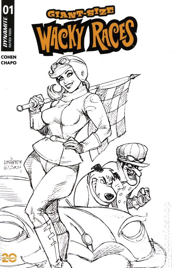 Written by Ivan Cohen. Art by Mariano Benitiz Chapo. Cover by Blank Cover. Featuring 40 pages of story and art! Thrill to the all-new adventures of Penelope Pitstop! This Giant-Size one-shot features three thrilling chapters that take us on a high-octane adventure from writer Ivan Cohen and super-star-artist-in-the-making Mariano Benitez-Chapo! Featuring a race-for-the-ages with tough and beautiful Penelope, handsome and mysterious Peter Perfect and of course Dick Dastardly (and a new look at Muttley! All of this action and high-speed adventure under three covers: Joseph Michael Linsner, Egal Galmon and Robert Hack! Ivan Cohen has written titles starring some of the best-loved and most-well known characters in fiction, ranging from Batman, Spider-Man, and the Teen Titans to Looney Tunes, Scooby-Doo, and even the Space Jam version of LeBron James. His work includes mainstream comics for all ages; custom projects for clients such as LEGO, Honda, Mars, Incorporated, and Snickers; the award-winning THE BATMAN & SCOOBY-DOO MYSTERIES, and the teen/adult-focused MULTIVERSITY: TEEN JUSTICE, featuring the breakthrough character Kid Quick. Wacky Races is an animated TV series, aired in 1968 to 1970 on CBS. The series was possibly inspired by the 1965 slapstick comedy The Great Race, as it consists of eleven drivers racing across North America in order to win the title of ''World's Wackiest Racer''. The cartoon has a large number of regular characters, with 23 people and animals spread among eleven race cars. 48 pages, full color. Rated T+ Cover price $4.99.