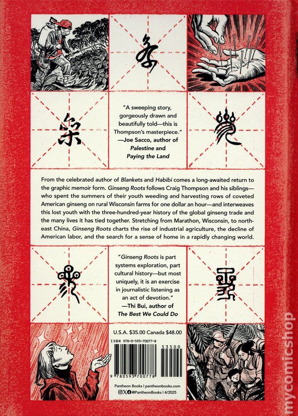 1st printing. Story and art by Craig Thompson. From the celebrated author of Blankets and Habibi comes a new graphic memoir exploring the class divide, childhood labor, family, and our globalized world-all centered on Wisconsin's ginseng farming industry. "A sweeping story, gorgeously drawn and beautifully told - this is Craig Thompson's masterpiece." -Joe Sacco, author of Palestine and Paying the LandWhen Blankets first published in 2003, Craig Thompson's seminal memoir about first love and faith lost in rural Wisconsin debuted to rapturous acclaim. The winner of two Eisner and three Harvey Awards, it is to this day considered one of the all-time great works of graphic storytelling. Now, in Craig's long-awaited return to the autobiographical form, comes the story that Blankets left out. Ginseng Roots follows Craig and his siblings, who spent the summers of their youth weeding and harvesting rows of coveted American ginseng on rural Wisconsin farms for one dollar an hour. In his trademark breathtaking pen-and-ink work, Craig interweaves this lost youth with the 300-year-old history of the global ginseng trade and the many lives it has tied together-from ginseng hunters in ancient China, to industrial farmers and migrant harvesters in the American Midwest, to his own family still grappling with the aftershocks of the bitter past. Stretching from Marathon, Wisconsin, to Northeast China, Ginseng Roots charts the rise of industrial agriculture, the decline of American labor, and the search for a sense of home in a rapidly changing world. Hardcover, 6-in. x 9-in., 448 pages, PC. Cover price $35.00.