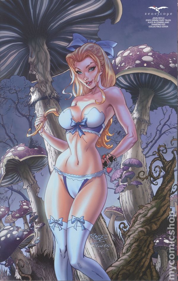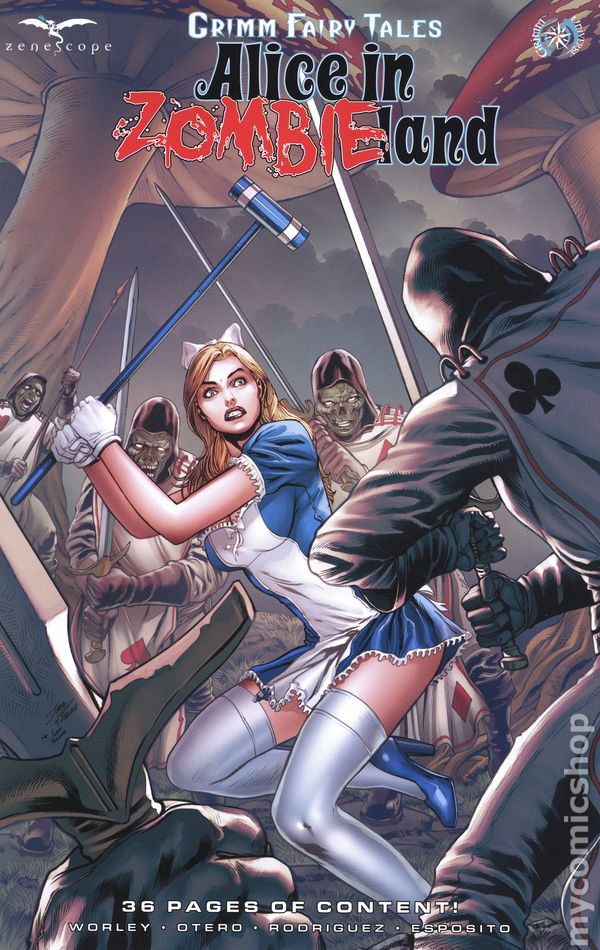 Limited 1 for 20 Retailer Incentive Variant Cover. Written by Joe Brusha, Dave Franchini. Cover by John Royle. Take another trip with Zenescope, down the rabbit hole, where the realm of dreams shows its true nature. Nothing is as it seems in this world, and when a familiar visitor finds her way into the madness that is Wonderland, she is followed by something even more horrible than the darkest nightmares that already haunt this place-Zombies! All hell is breaking loose and only Alice and a few new allies can hope to put the horrors back where they belong! Cover price $10.00.