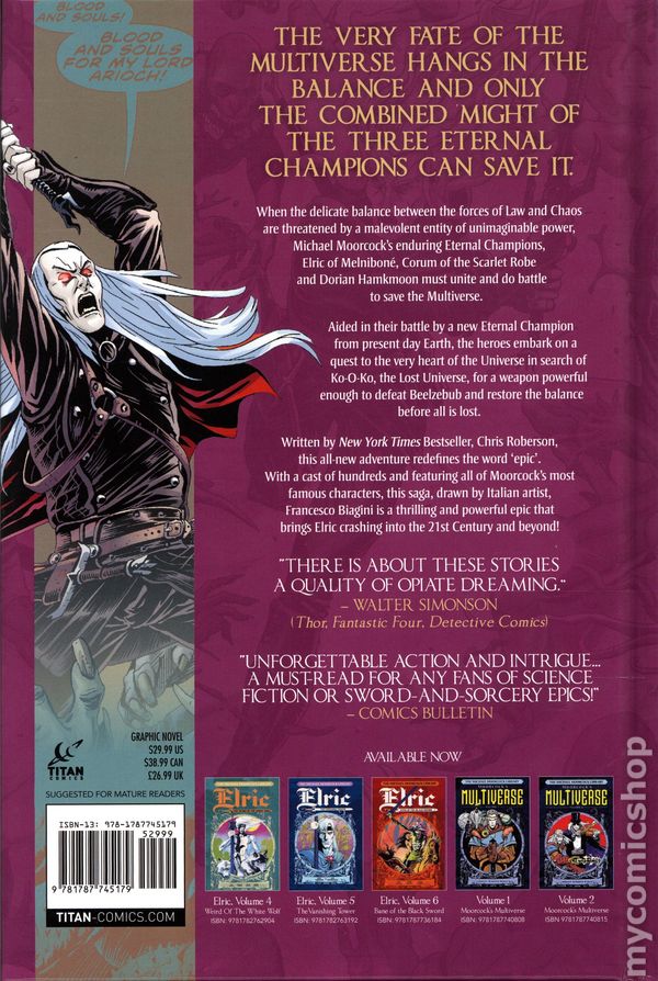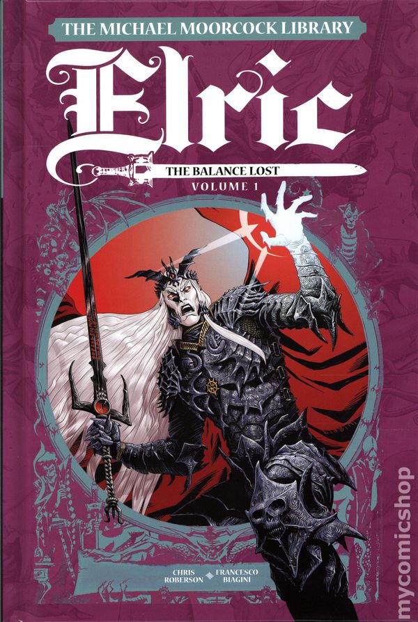 Volume 1 - 1st printing. Collects Elric: The Balance Lost (2011 Boom) #1-6. Based on the Story by Michael Moorcock. Adapted by Chris Roberson. Art and cover by Francesco Biagini. FOR THE FIRST TIME EVER, ELRIC, CORUM AND DORIAN HAWKMOON MUST UNITE TO SAVE THE COSMIC BALANCE BETWEEN LAW AND CHAOS. This first volume collects the first six issues of Elric: The Balance Lost and also the 10-page Free Comic Book Day prelude, by NEW YORK TIMES bestselling author, Chris Roberson! When the delicate balance between the forces of Law and Chaos are by threatened by a powerful malevolence of unimaginable power, Michael Moorcock's enduring Eternal Champions, Elric of Melniboné, Corum of the Scarlet Robe and Dorian Hamkmoon must unite and do battle to save the Multiverse. From their ancient realms to modern-day New Orleans and across the Moonbeam Roads in search for the Horn of Fate, a device that will open portals to other dimensions the heroes set forth. Added in their battle by a new Eternal Champion from present day Earth, the heroes embark on a quest to find weapons powerful enough to defeat Beelzebub and together they journey to the very physical heart of the Universe in search of Ko-O-Ko, the Lost Universe, on a mission to restore the balance before all is lost. Hardcover, 160 pages, full color. Mature Readers Cover price $29.99.