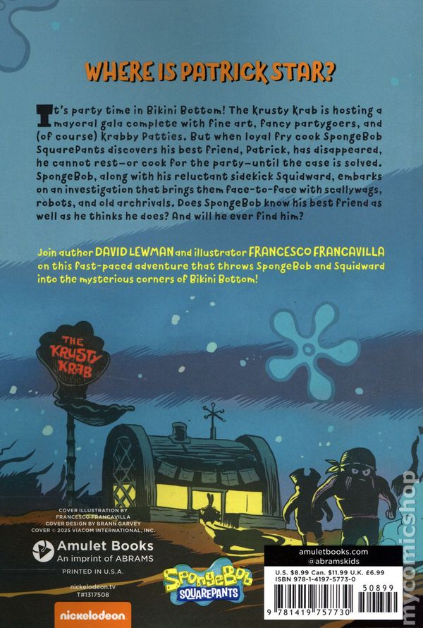 Volume 1 - 1st printing. "Find a Missing Star!" Written by David Lewman. Art and cover by Francesco Francavilla. Uncover the mysteries of Bikini Bottom with SpongeBob SquarePants and his friends in this all-new middle-grade series! On the eve of a mayoral event happening at the Krusty Krab, SpongeBob's best friend Patrick Star goes missing! With no one willing to help find him, SpongeBob and Squidward put on their best detective gear and hit the case themselves. But as their investigation leads them to the darkest corners of Bikini Bottom, secrets about SpongeBob's best friend are quickly revealed! Softcover, 5-in. x 7-in., 224 pages, Text (with B&W Chapter Illustrations) Cover price $8.99.