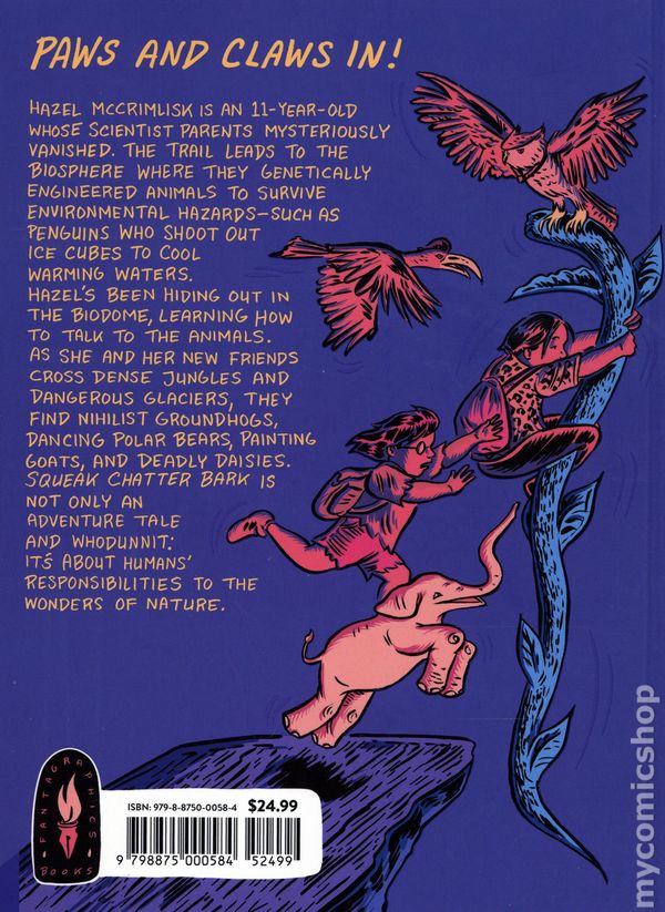 1st printing. Story and art by Ali Fitzgerald. In this charming middle-grade graphic novel, 11-year-old Hazel McCrimlisk's scientist parents are kidnapped inside the ecosphere they live and work in. Can Hazel and her friends find them in time? Hazel and her parents live an idyllic life in a treehouse in the PAW (Perfect Animal Worlds) Biosphere among a series of ecologically controlled environments populated by genetically created and enhanced animals and flora. As scientists working for PAW, together with founder Dr. Henry Nimick, the McCrimlisk's mission is to create a world that will usher in an era of "good evolution", populated with animals and plants that can transform pollution and other environmental hazards to make the region clean and habitable. But one foggy night, Hazel's parents are suddenly kidnapped. With the help of her animal friends Chimi (a multilingual toucan), Nina (a pet-sized elephant who exhibits super-strength), and her human friend (comics lover and mythology expert) Alex, Hazel tracks clues throughout the various biodomes and climates uncovering what happened to her parents and leading her to... a monster?!? Author Ali Fitzgerald charmingly wrote, drew, lettered, and colored this book featuring an imaginative setting rich with detail and an expressive brush-pen style with a good sense of personality and motion. Her colorful, anthropomorphic characters are bright and funny sleuths alongside Hazel as they follow the clues together. Filled with puns and hijinks, readers will delight in this mystery with an ecological message. Softcover, 6 1/2-in. x 9 1/2-in., 248 pages, PC. Cover price $24.99.