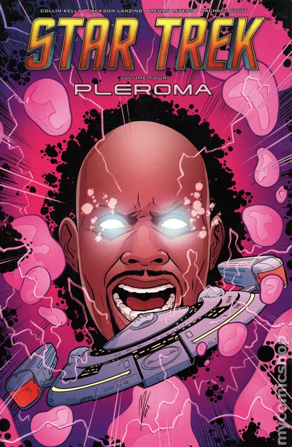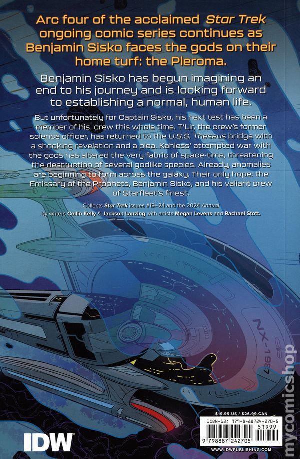 Volume 4 - 1st printing. "Pleroma!" Collects Star Trek (2022 IDW) #19-24 and Star Trek (2022 IDW) Annual 2024. Written by Collin Kelly and Jackson Lanzing. Art by Megan Levens and Rachel Stott. Cover by Megan Levens. Arc four of the acclaimed Star Trek ongoing comic series continues here in the collected paperback! Benjamin Sisko faces the gods themselves on their home turf: the Pleroma. Acclaimed writers Jackson Lanzing and Collin Kelly along with Star Trek: Strange New Worlds comics artist Megan Levens (Buffy the Vampire Slayer, Starsigns) welcome you to the thrilling brand-new chapter of the Eisner-nominated Star Trek flagship series! Benjamin Sisko has begun imagining an end to his journey and is looking forward to establishing a normal, human life. But unfortunately for Captain Sisko, his next test has been a member of his crew this whole time... T'Lir, the crew's former science officer, has returned to the U.S.S. Theseus bridge with a shocking revelation and a plea. Kahless' attempted war with the gods has altered the very fabric of spacetime, threatening the destruction of several godlike species. Already, anomalies are beginning to form across the galaxy. Their only hope: the Emissary of the Prophets, Benjamin Sisko, and his valiant crew of Starfleet's finest. Softcover, 200 pages, full color. Cover price $19.99.
