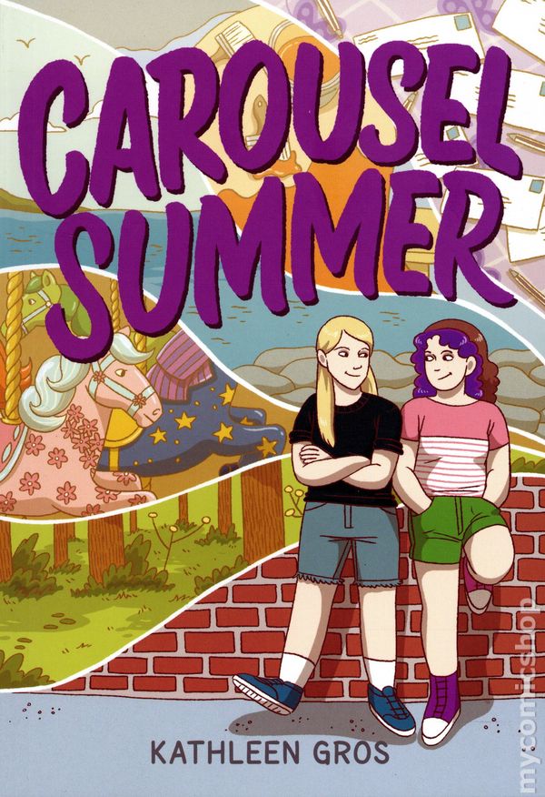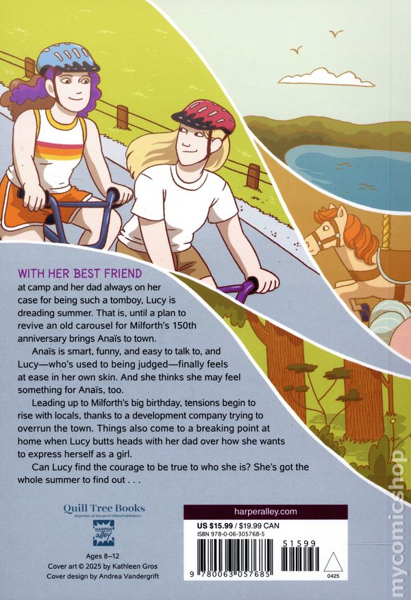 1st printing. Story and art by Kathleen Gros. With their rapidly gentrifying town of Milforth causing fights between her brother and her dad, summer isn't looking great for twelve-year-old Lucy. At least, that's what Lucy thinks... until Milforth's plan to revive an old carousel for the town's one hundred fiftieth anniversary brings artist Ray and her daughter, Anaïs, to town. Suddenly Lucy's summer is looking up! Anaïs is smart, funny, and easy to get along with, and for Lucy-who's not the most popular girl in her middle school-Anaïs is just the person that could take Lucy's summer from dire to fire. The two bike around town, help Ray with the carousel restoration, and bond over their love of fantasy novels. Used to being judged for her looks and interests, Lucy finally feels at ease to be herself. And she thinks she may feel something for Anaïs, too. But with tensions rising at home, and with locals, thanks to a wheeling-and-dealing development company looking to build new condos in town, Lucy soon finds herself in a constant state of battle with her dad. Can Lucy find the courage to be true to herself? Softcover, 5 1/2-in. x 8-in., 304 pages, full color. Cover price $15.99.