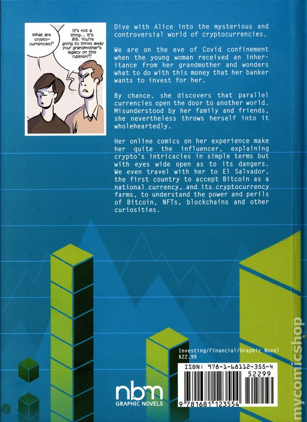 1st printing. Written by Daniel Villa Monteiro. Art and cover by Nicolas Balas. Translated by Daniel Villa Monteiro. Margaret Morrison. Foreword by Dive with Alice into the mysterious and controversial world of cryptocurrencies. We are on the eve of Covid confinement when a young woman receives an inheritance from her grandmother and wonders what to do with this money that her banker wants to invest for her. By chance, she discovers that parallel currencies open the door to another world. Misunderstood by her family and friends, she nevertheless threw herself into it wholeheartedly. Her online comics on her experience make her quite the influencer, explaining crypto's intricacies in simple terms but with eyes wide open as to its dangers. We even travel with her to El Salvador, the first country to accept Bitcoin as a national currency, and its cryptocurrency farms, to understand the power and perils of Bitcoin, NFTs, blockchains and other curiosities. Hardcover, 6 3/4-in. x 9 1/2-in., 112 pages, full color. Cover price $22.99.