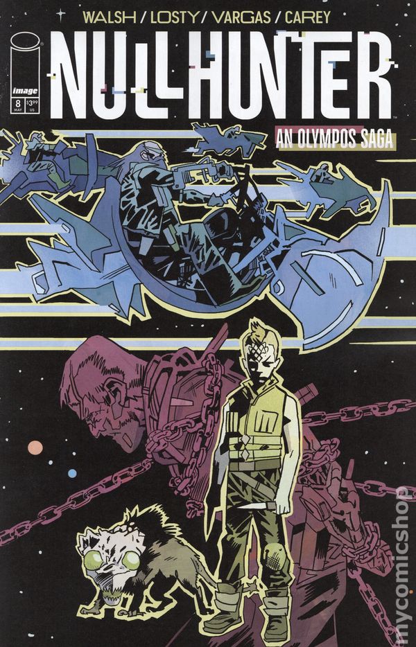 Written by Michael Walsh, Aaron Losty. Art by Gustaffo Vargas. Cover by Michael Walsh. A mission goes awry, and Clay is captured by a barbaric gang of hover bikers. After narrowly escaping the Maneaters himself, Simon assembles a crew of street orphans for the blood-soaked rescue mission. From writer MICHAEL WALSH, guest writer AARON LOSTY, and artist GUSTAFFO VARGAS, the eighth chapter of NULLHUNTER, the cyberpunk retelling of Hercules, is out in May. 28 pages, full color. Rated M Cover price $3.99.
