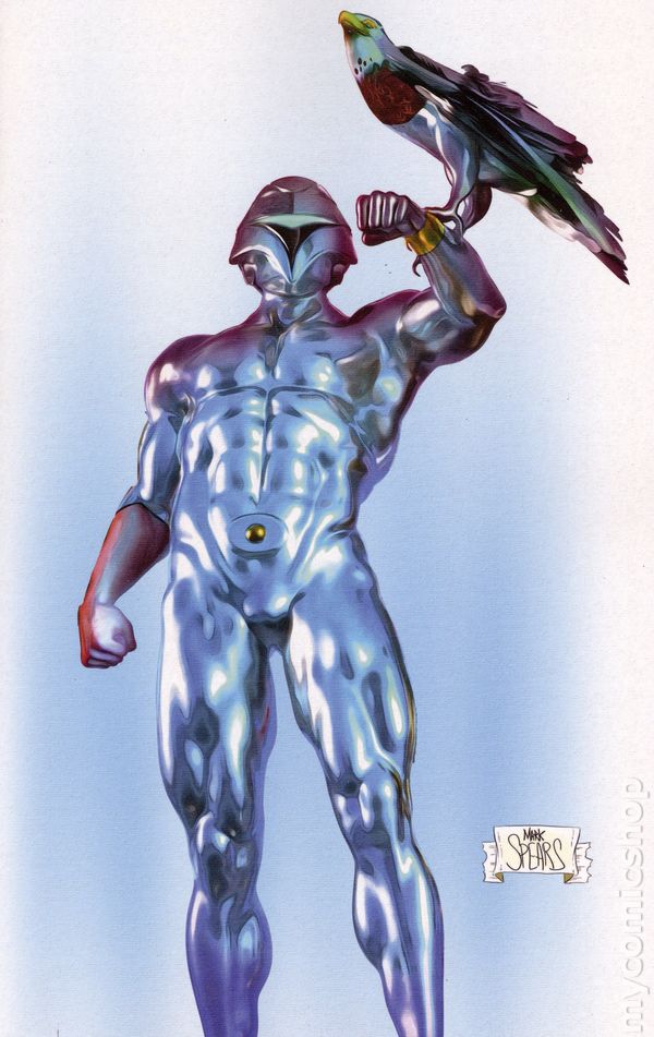 Metal Premium. Written by Ed Brisson. Art by George Kambadais. Cover by Mark Spears. On the Planet of Mimes, the villainous Windhammer is wreaking havoc, devestating the landscape with an ever-escalating series of violent storms. Unable to stem the onslaught, Steelheart and Steelwill work tirelessly to help evacuate the Mimes while waiting for reinforcements. But when Condor and the SilverHawks arrive to take down the threat, Windjammer is ready with reinforcements of his own - and in the aftermath of the climactic battle, the SilverHawks and their legacy will be forever changed! Cover price $100.00.
