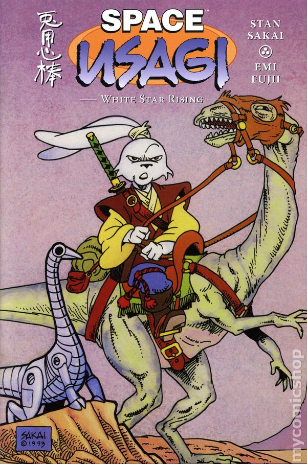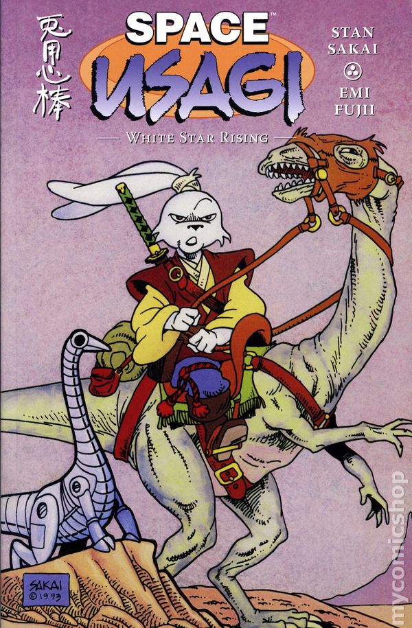 1st printing. Collects Space Usagi: White Star Rising (2024 Dark Horse) #1-3. Story and art by Stan Sakai. The rabbit ronin's classic adventures in space continue-now in color! Taking place directly after the Space Usagi: Death and Honor arc, Stan Sakai's second Space Usagi series sees Miyamoto Usagi continuing to defend the Shirohoshi clan in the far future from scheming rivals, the Kajitori. New friends, like space pirate Rhogen, and new enemies, led by Empress Amateh, are introduced in this miniseries now colored by longtime collaborator Emi Fujii! This collection also includes new stories by Julie Sakai and Stan Sakai, featuring Space Usagi's Akemi character! Softcover, 6-in.x 9-in., 128 pagers, full color. Cover price $17.99.