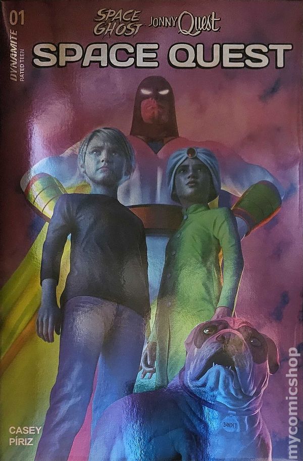 Virgin Foil Cover. Written by Joe Casey. Art by Sebastian Piriz. Cover by Mark Spears. At last, the meeting the cosmos demanded! The Quest Family is legendary for how far they'll go in the spirit of exploration and discovery, but now they're headed for outer space! Jonny and the gang are brought in to investigate a mysterious potentially alien spacecraft being held at Area 51. And where there's a spaceship there's bound to be aliens, right? What happens when Space Ghost and Jonny Quest cross paths? The greatest entertainment event of the twenty-first century, that's what! Brought to you by the acclaimed creative team of Jonny Quest! 32 pages, full color. Rated T Cover price $29.99.