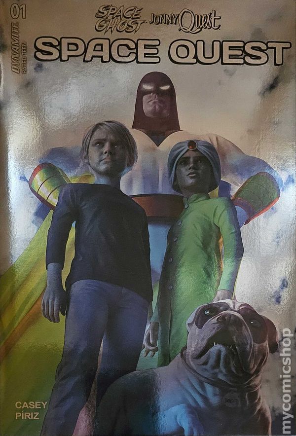 Foil Cover. Written by Joe Casey. Art by Sebastian Piriz. Cover by Mark Spears. At last, the meeting the cosmos demanded! The Quest Family is legendary for how far they'll go in the spirit of exploration and discovery, but now they're headed for outer space! Jonny and the gang are brought in to investigate a mysterious potentially alien spacecraft being held at Area 51. And where there's a spaceship there's bound to be aliens, right? What happens when Space Ghost and Jonny Quest cross paths? The greatest entertainment event of the twenty-first century, that's what! Brought to you by the acclaimed creative team of Jonny Quest! 32 pages, full color. Rated T Cover price $9.99.