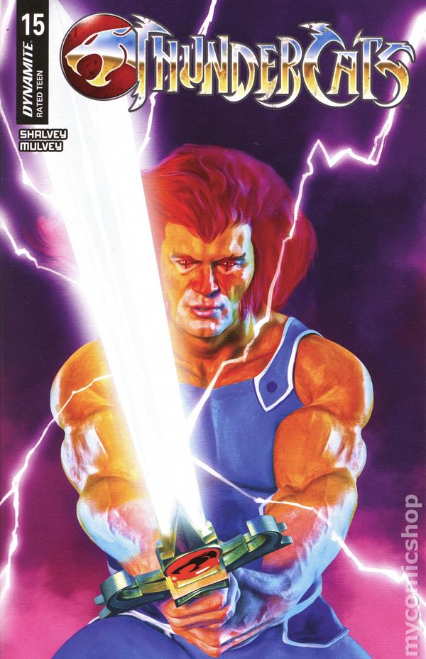Written by Declan Shalvey. Art by Joe Mulvey. Cover by Mark Spears. After successfully repelling Mumm-Ra's all-out attack on the Cat's Lair with the help of Calica and her new android allies, the ThunderCats are left with a single burning question: Where is Lion-0? The answer to that mystery is finally revealed here, as the brash young leader escapes from Mumm-Ra's captivity with the help of a mysterious robed stranger only to find himself alone on an alien world, fighting for his life! 32 pages, full color. Rated T Cover price $4.99.