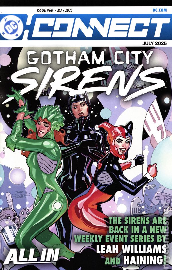 May 2025 DC catalog for July 2025 releases and beyond. Cover by Terry Dodson and Rachel Dodson (Gotham City Sirens: Unfit for Orbit). Highlights from this issue: Superman Treasury 2025 #1 variant cover pencils by Dan Jurgens; Batman/Superman: World's Finest #41 Superman movie variant cover prelim by Kevin Maguire. 56 pages, full color. Cover price $0.25.