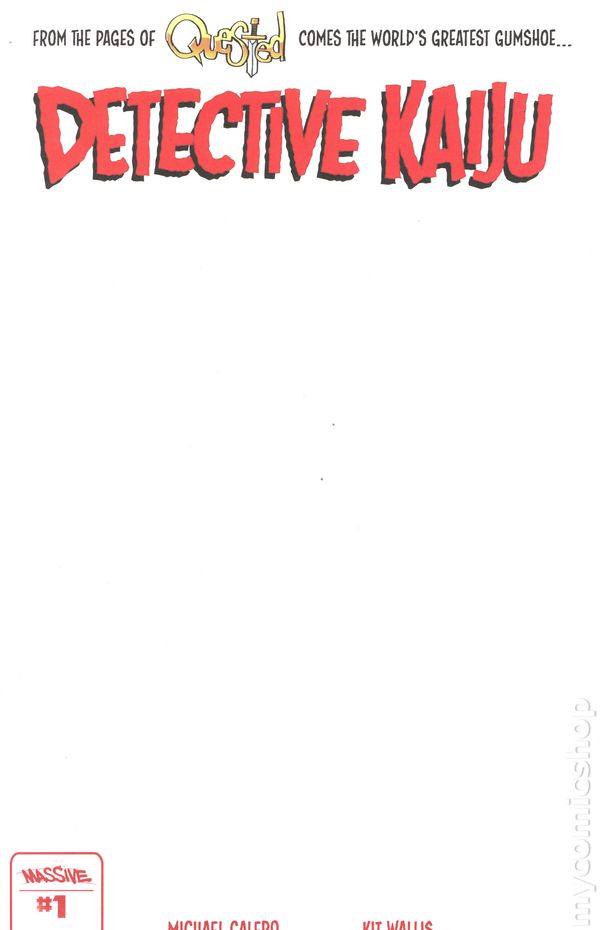Written by Michael Calero. Art by Kit Wallis. Blank Cover. From the pages of the fan-favorite series Quested comes a noir comic of epic proportion! Detective Kaiju the hardboiled investigator gets his own mini-series with Questeds Michael Calero (American Psycho) and Kit Wallis (High On Life) reuniting on the 3 part murder mystery. In this debut issue, Detective Kaijus past catches up with him when the body of an old friend is discovered in South Faerbraun. Now he must face the demons of his past while investigating the unusual murder. 32 pages, full color. Cover price $6.99.