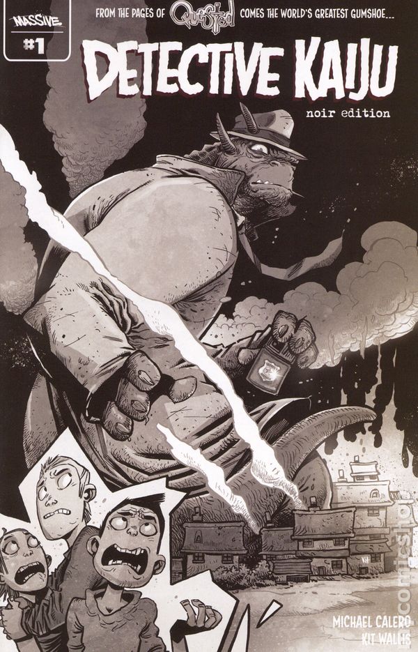 Written by Michael Calero. Art and Cover by Kit Wallis. From the pages of the fan-favorite series Quested comes a noir comic of epic proportion! Detective Kaiju the hardboiled investigator gets his own mini-series with Questeds Michael Calero (American Psycho) and Kit Wallis (High On Life) reuniting on the 3 part murder mystery. In this debut issue, Detective Kaijus past catches up with him when the body of an old friend is discovered in South Faerbraun. Now he must face the demons of his past while investigating the unusual murder. 32 pages, Full B&W. Cover price $4.99.