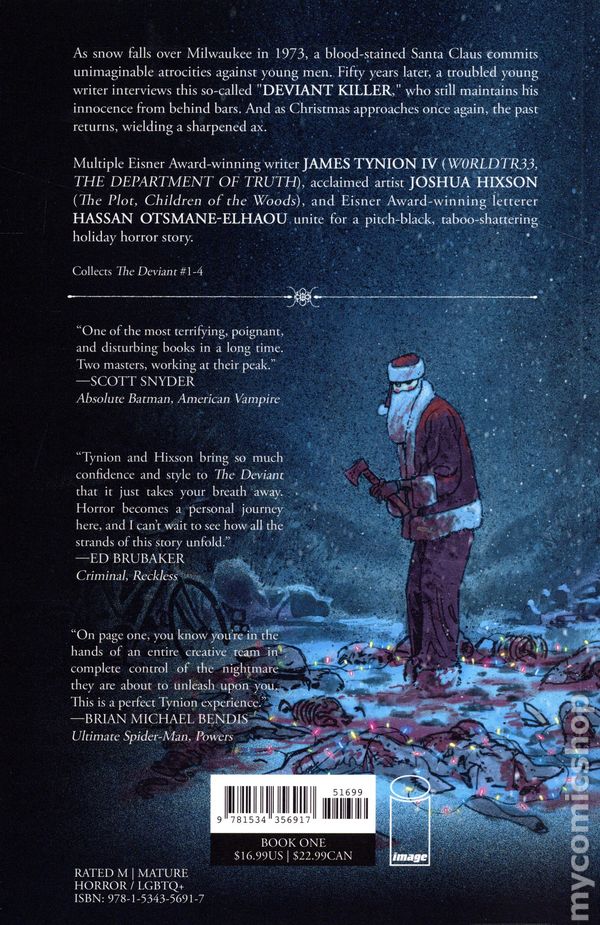 Volume 1 - 2nd and later printings. Collects The Deviant (2023 Image) #1-4. Written by James Tynion Iv. Art and Cover by Joshua Hixson. HANNIBAL meets SILENT NIGHT, DEADLY NIGHT in this pitch-black holiday horror story that cuts right through our most taboo notions. As snow falls over Milwaukee in 1972, a blood-stained Santa Claus commits unimaginable atrocities against young men. Fifty years later, a troubled young writer interviews this so-called "Deviant Killer," who still maintains his innocence from behind bars. And as Christmas approaches once again, the past returns, wielding a sharpened ax. Softcover, 144 pages, full color. Mature Readers Cover price $16.99.