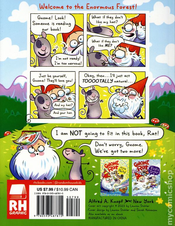 Volume 1 - 1st printing. Story and art by Lauren Stohler. Gnome and Rat are best friends who live together in a charming forest. Rat enjoys drinking tea and finishing crossword puzzles. And Gnome... well, Gnome likes to polish his pointy red hat and eat delicious sausages. Join these funny friends on their various adventures, whether it's celebrating Hat Day, perfecting magic tricks, or tracking down a new signature hat for Gnome. Whatever their antic, these two know exactly how to have a good time: with each other. Softcover, 6 1/2-in. x 8 1/2-in, 80 pages, full color. Cover price $7.99.