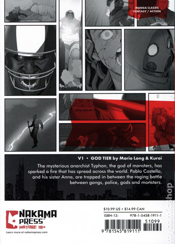 Volume 1 - 1st printing. Written by Mario B. Long. Art by Kuroi, Pablo Rey, and Yufo. Cover by Kuroi. The mysterious anarchist Typhon, the god of monsters, has sparked a fire that has spread across the world. Pablo Costello, and his sister Anna, are trapped in between the raging battle between gangs, police, gods and monsters. Softcover, 5-in. x 7-in., 144 pages, B&W. Mature Readers Cover price $10.99.