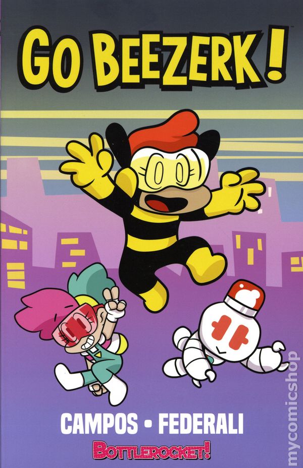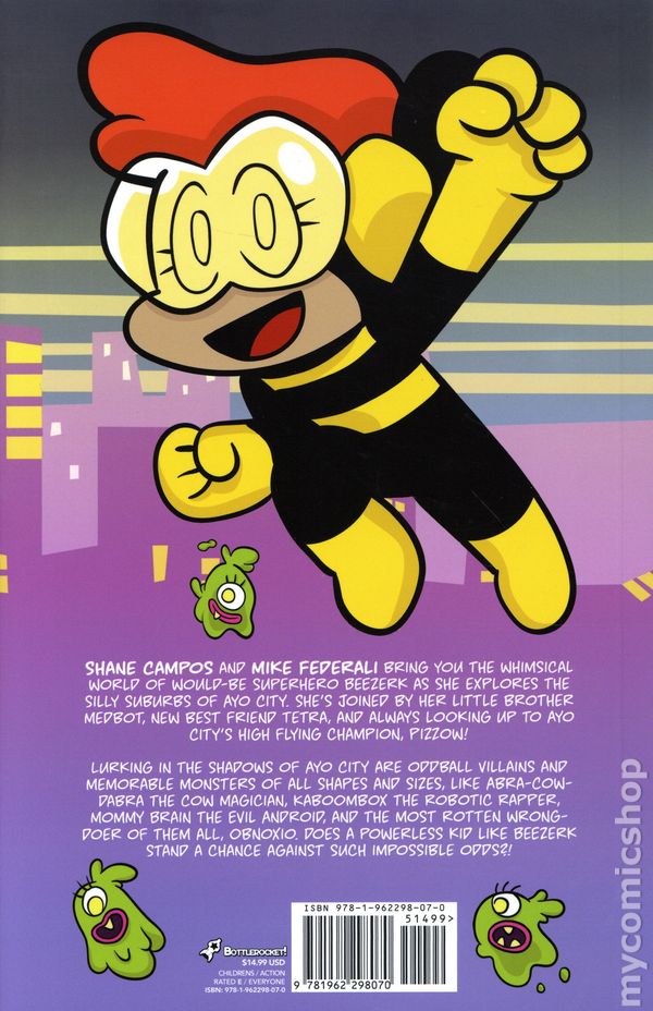 Volume 1 - 1st printing. Written by Mike Federali. Art and cover by Shane Campos. Shane Campos and Mike Federali bring you the whimsical world of would-be superhero Beezerk as she explores the silly suburbs of Ayo City. Shes joined by her little brother Medbot, new best friend Tetra, and always looking up to Ayo Citys high flying champion, Pizzow! Lurking in the shadows of Ayo City are oddball villains and memorable monsters of all shapes and sizes, like Abra-Cow-Dabra the Cow Magician, Kaboombox the Robotic Rapper, Mommy Brain the Evil Android, and the most rotten wrongdoer of them all, Obnoxio. Does a powerless kid like Beezerk stand a chance against such impossible odds?! Softcover, 6-in.x 9-in., 100 pages, full color. All Ages Cover price $14.99.